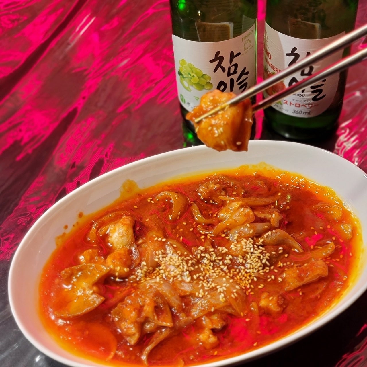 辛味のたれに浸かっている牛ホルモンや玉ねぎは、少々のどにヒリヒリしたものが広がりますが、噛めば噛むほど出てくる、肉汁や旨味が辛味を緩和させ、ご飯を一緒に食べたくなること間違いなしで、お酒にもピッタリの料理です。また、上からかけられている白ゴマの風味も一つのアクセントとして楽しんでいただけます。