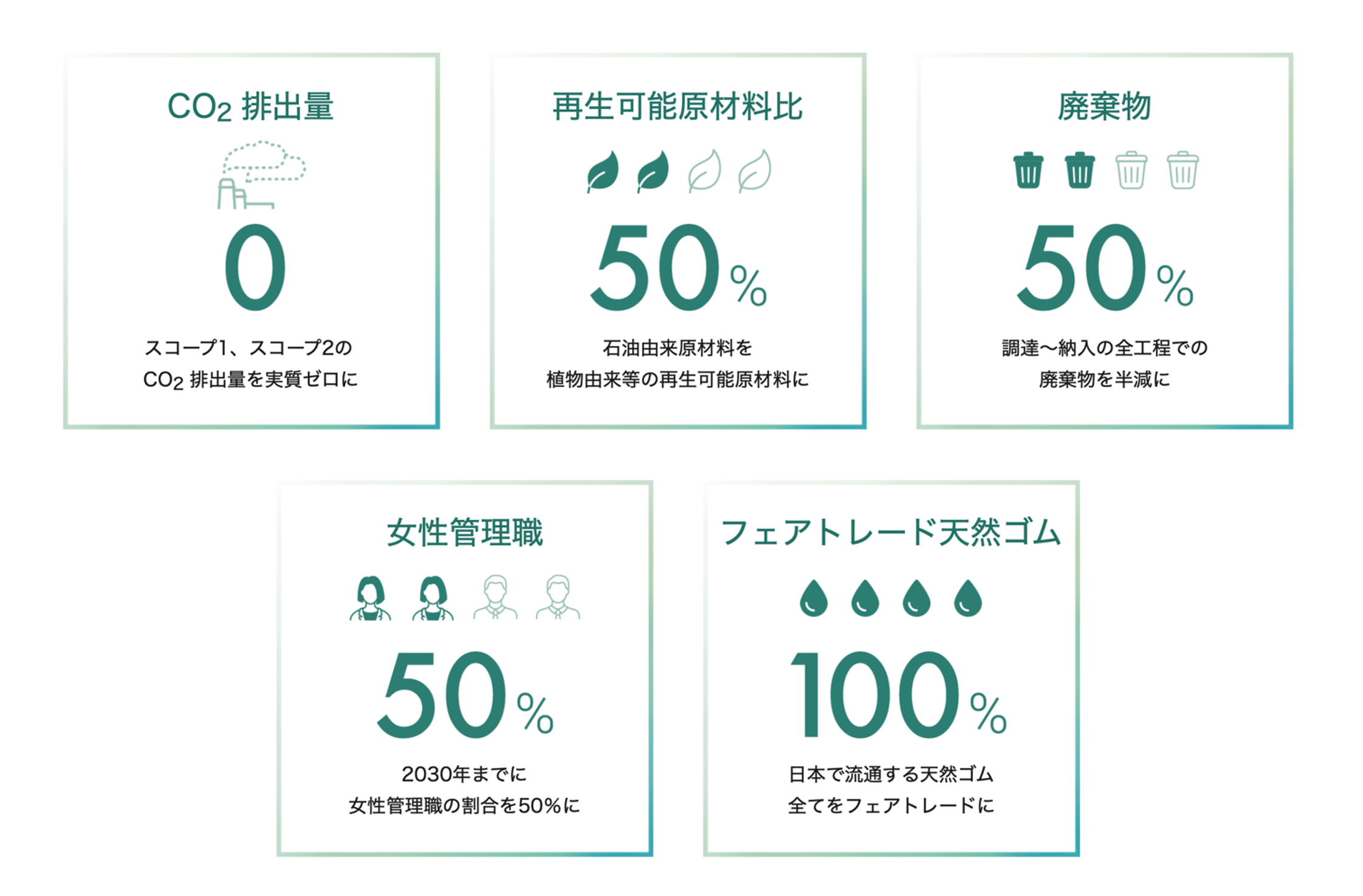 天然ゴムにも強制労働や不当取引等の懸念があることを知ってもらい、日本の天然ゴム製品を全てフェアトレード化することを目標に、自社監査により、当社調達の天然ゴムがフェアトレードであることを証明、表明し、同条件で他社も使用できるフェアトレード天然ゴムマークを作成、公開。