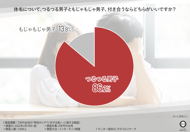 そこで、「体毛について、つるつる男子ともじゃもじゃ男子、付き合うならどちらがいいですか?」と質問したところ、『つるつる男子(86.2%)』『もじゃもじゃ男子(13.8%)』という結果になりました。