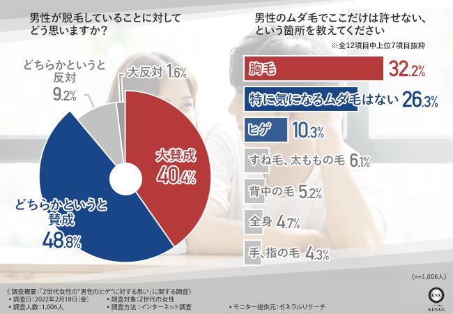 男性の脱毛に対して賛成の方が多いことから、Z世代の女性は、男性に清潔感を求めているのかもしれません。