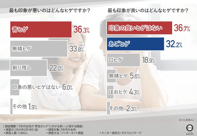 そこで、「最も印象が悪いのはどんなヒゲですか?」と質問したところ、『青ヒゲ(36.3%)』と回答した方が最も多く、次いで『無精ヒゲ(33.8%)』『剃り残し(22.0%)』と続きました。
