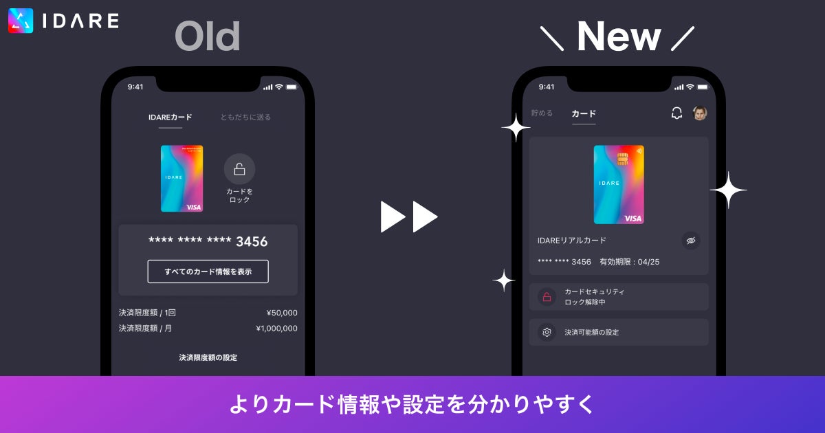 『オンライン決済や街中での決済でご利用できるIDAREカード情報が表示される「使う画面」を以下のように変更し、カード情報や設定を分かりやすくなりました。』
