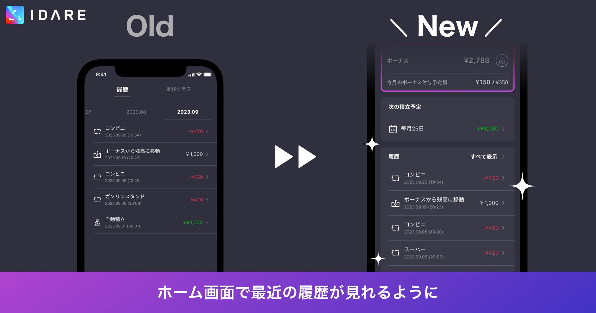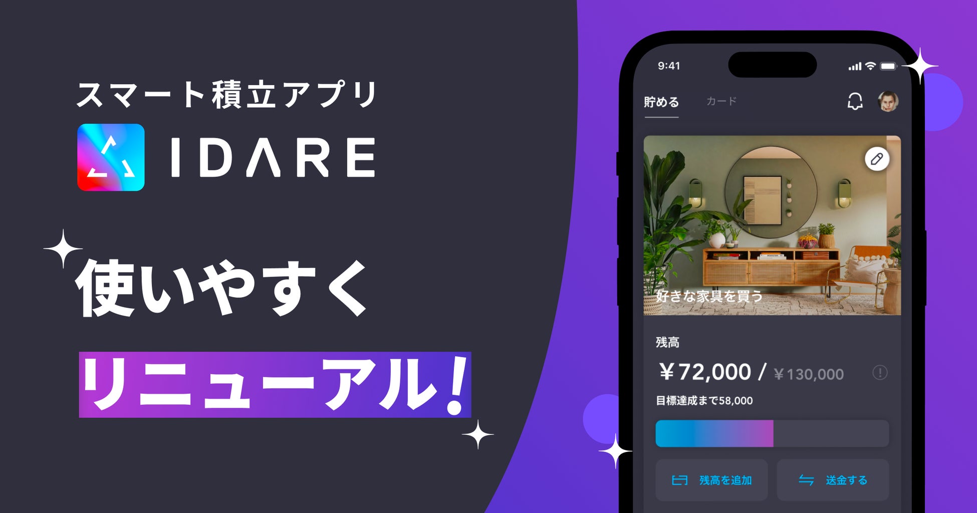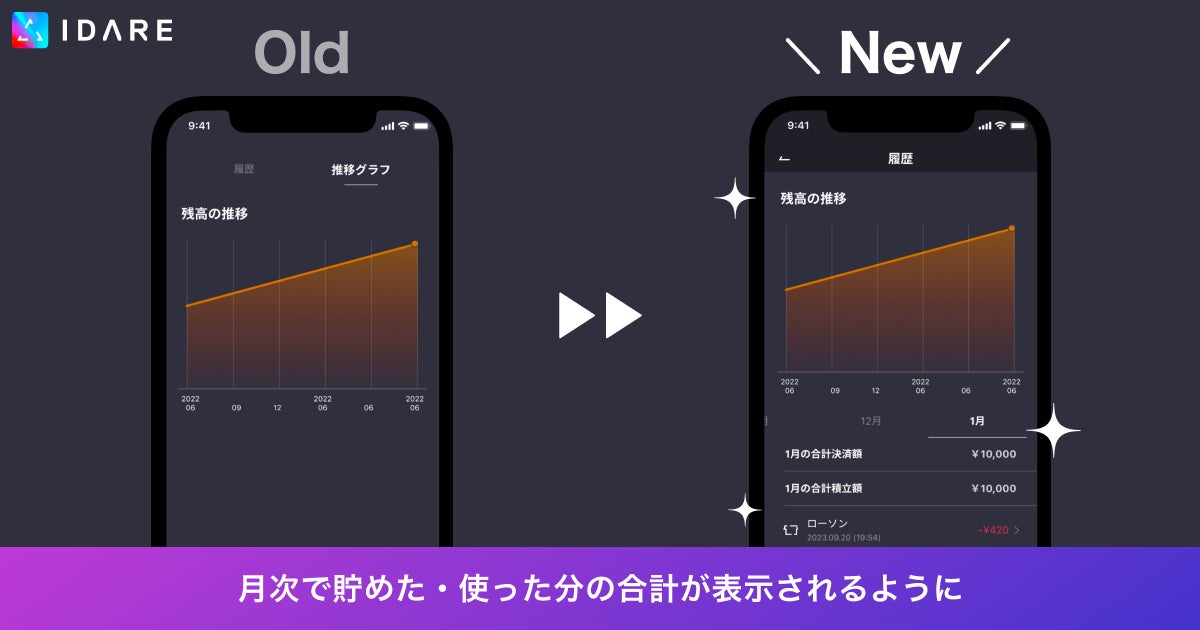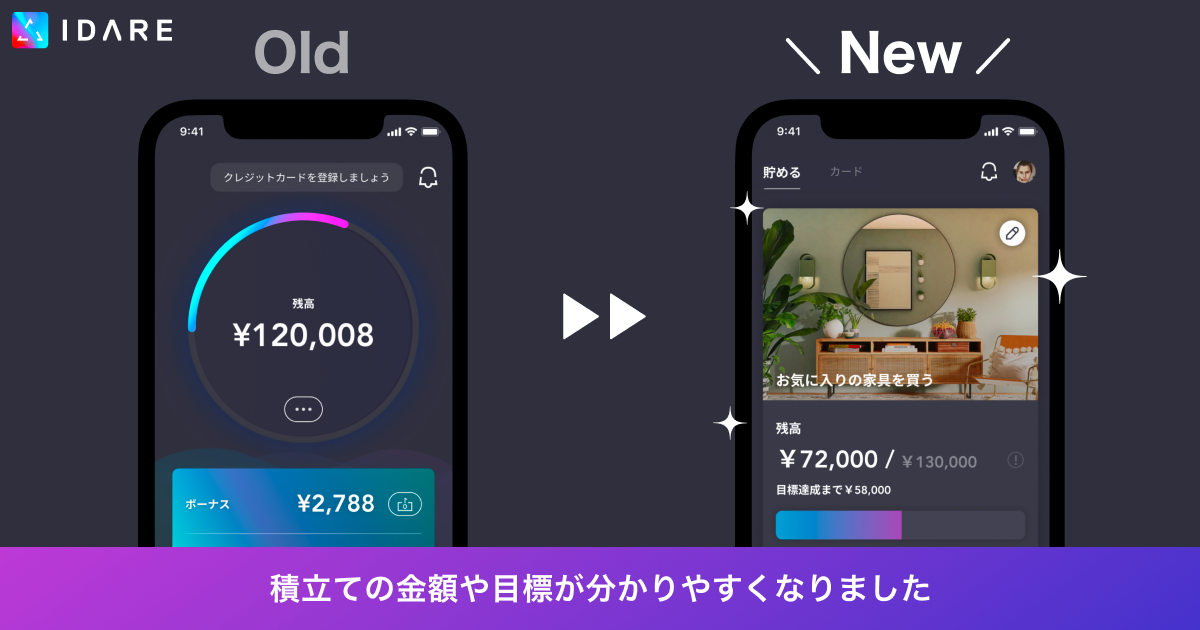 『IDAREアプリを起動すると表示される「貯める画面」を以下のように変更し、積み立てている金額や目標が分かりやすくなりました。』