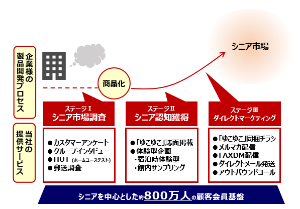 事業ステージを3つに分類し、弊社のシニア会員の皆さまと自社メディアを掛け合わせて企業に最適なマーケティング支援・ソリューション提案を行います。会員の皆さまはゆこゆこのさまざまな媒体を通じて、企業の情報に触れることが可能です。