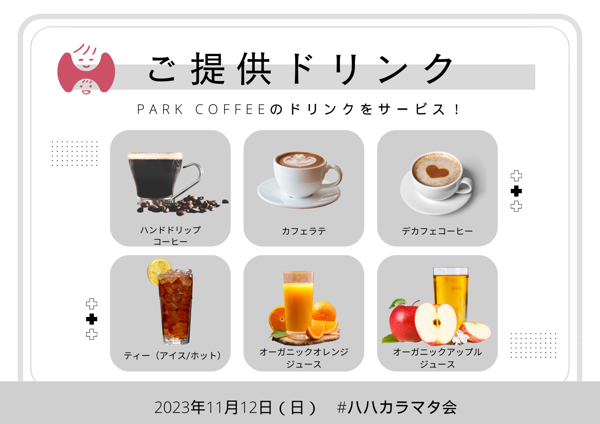 今回は品川区でコミュニティ拠点となるカフェ「PARKCOFFEE」を拠点にまちづくりに取り組む東急株式会社にプレファミリーの憩いの場というコンセプトに共感いただき、実現したイベントです。大井町駅徒歩2分のアクセスも店内の雰囲気もよいPARK COFFEEさんを会場として貸していただき、開催の運びとなりました。カフェでおこなうことで挽きたてのデカフェコーヒーを飲みながらゆったりとした午前の時間を過ごせるそんな特別なひとときをご提供いたします。