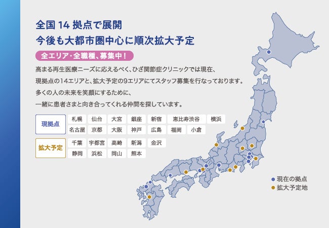 ひざ関節症クリニックは、現在全国14拠点で展開中ですが、今後さらに9つの院を開院予定。近い将来23拠点に拡大予定です。