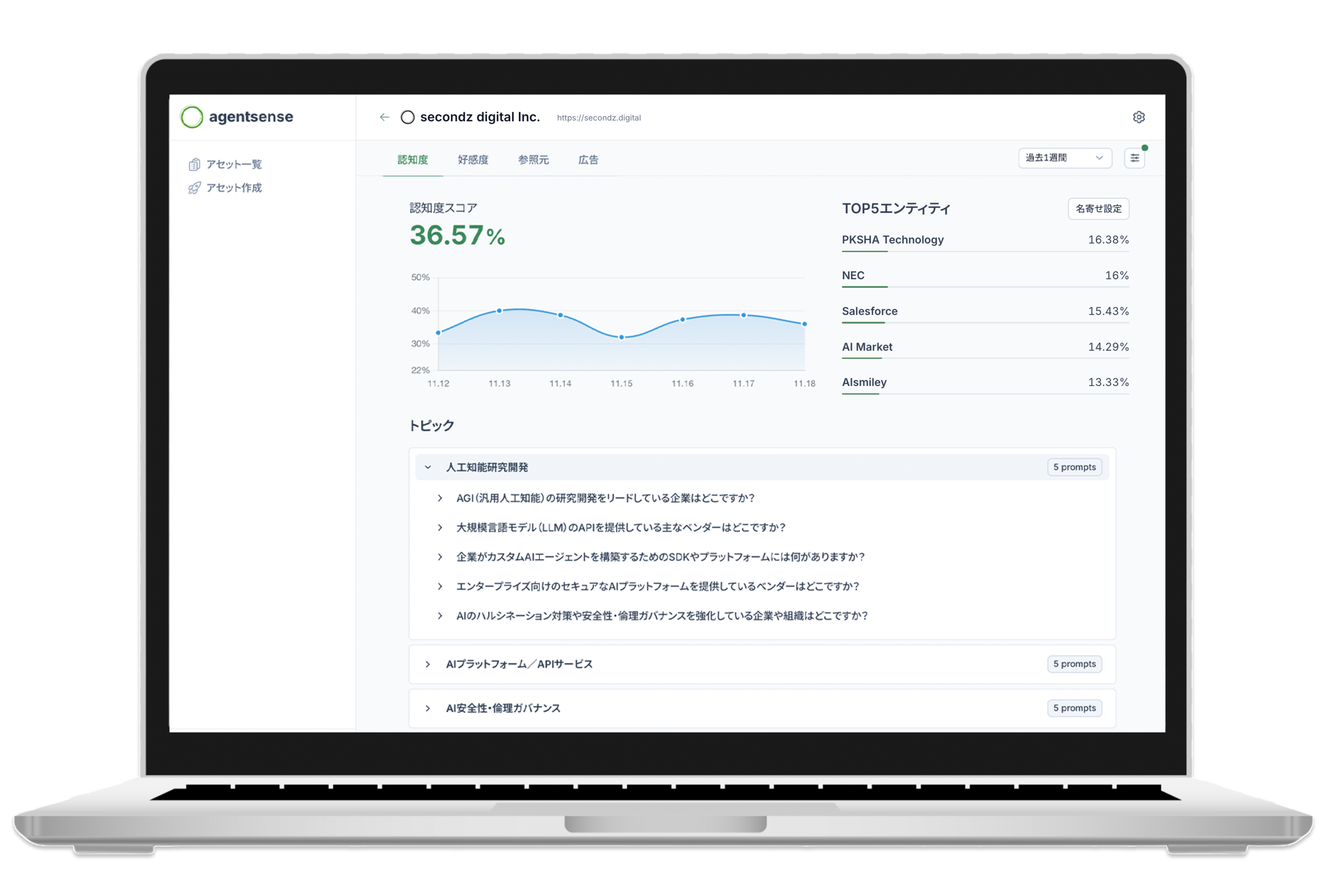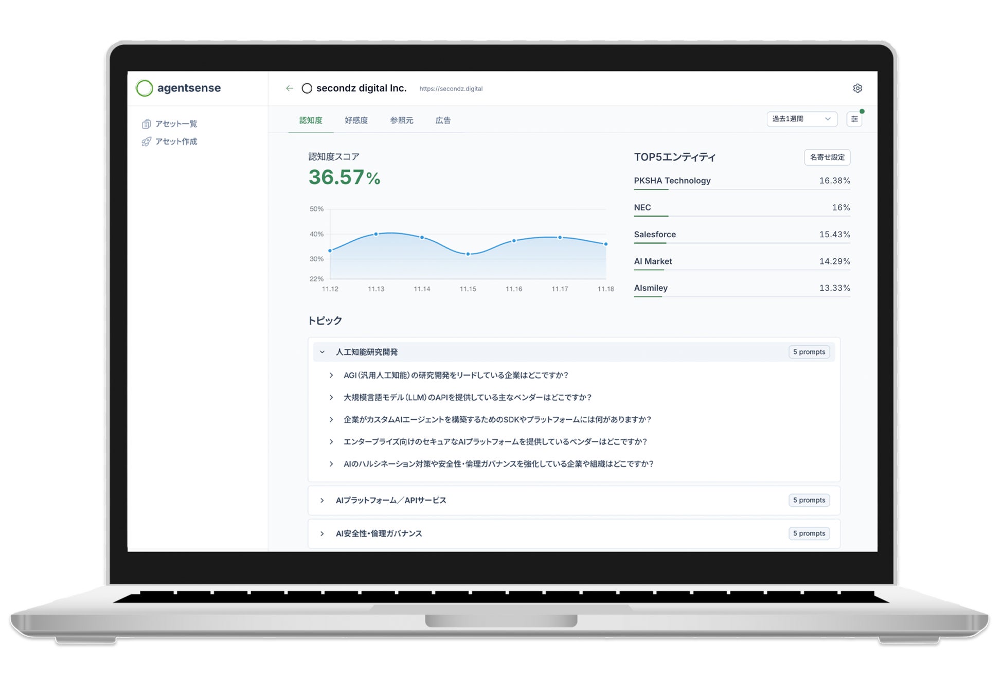 2025年には、AI検索時代におけるブランド可視性を分析・改善するAI検索最適化プラットフォーム「secondz Agentsense」を独自開発。生成AI検索における企業・サービスの言及状況や評価を可視化し、AI検索最適化(AEO:AI Engine Optimization)およびGEO(Generative Engine Optimization)を支援。