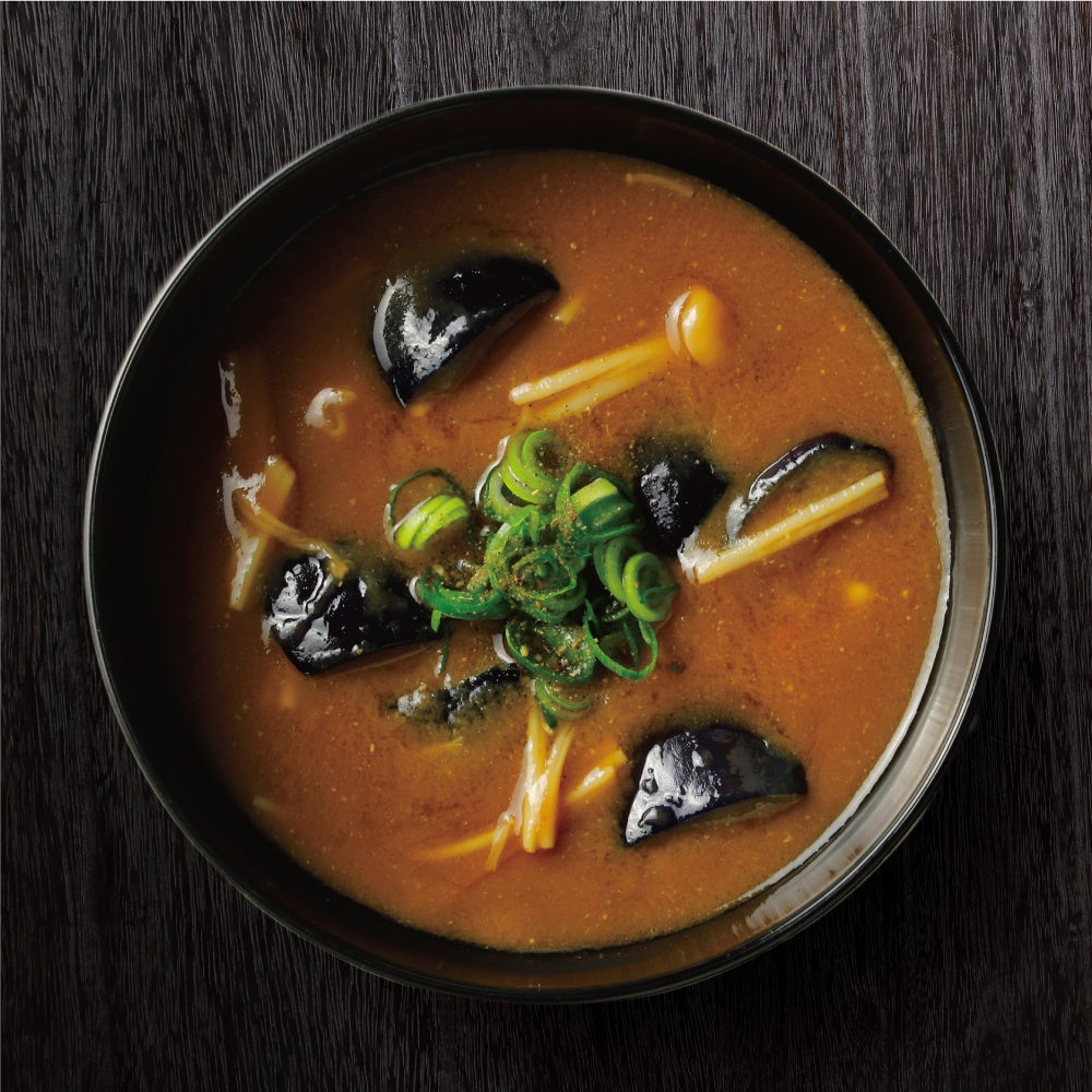 京都 石野味噌の赤だし味噌と麹味噌を組み合わせ、赤だし本来の旨味とコク、香りを追求しました。お出汁が染み込んだ焼き茄子と、大ぶりのなめこの旨味が溶け合います。