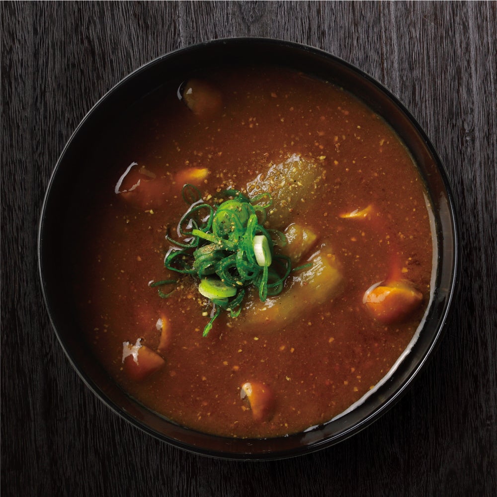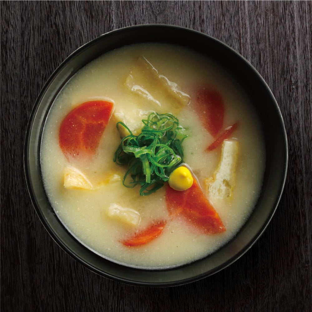 京都 西京味噌の赤だしと麹味噌を合わせました。大豆の香りと米麹由来の甘味が印象的な口当たり。たっぷりと入った食材に、ぴりっと効いた山椒が調和する、贅沢な味わいをご堪能ください。