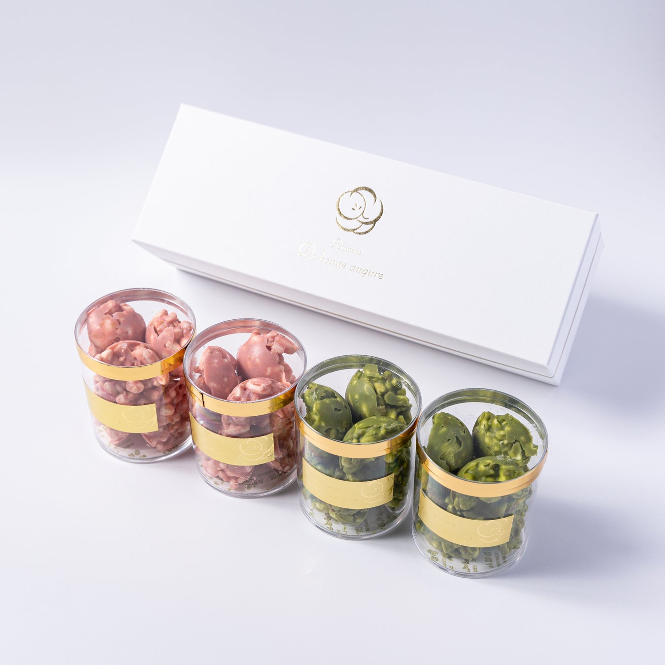 商品はもみじ饅頭をオマージュした「福寿の種」、日本で最も古い歴史を持つお菓子と言われる「おこし」をチョコレートでコーティングした「チョコおこし」の2種類をそれぞれギフトボックスに入れてご用意しました。