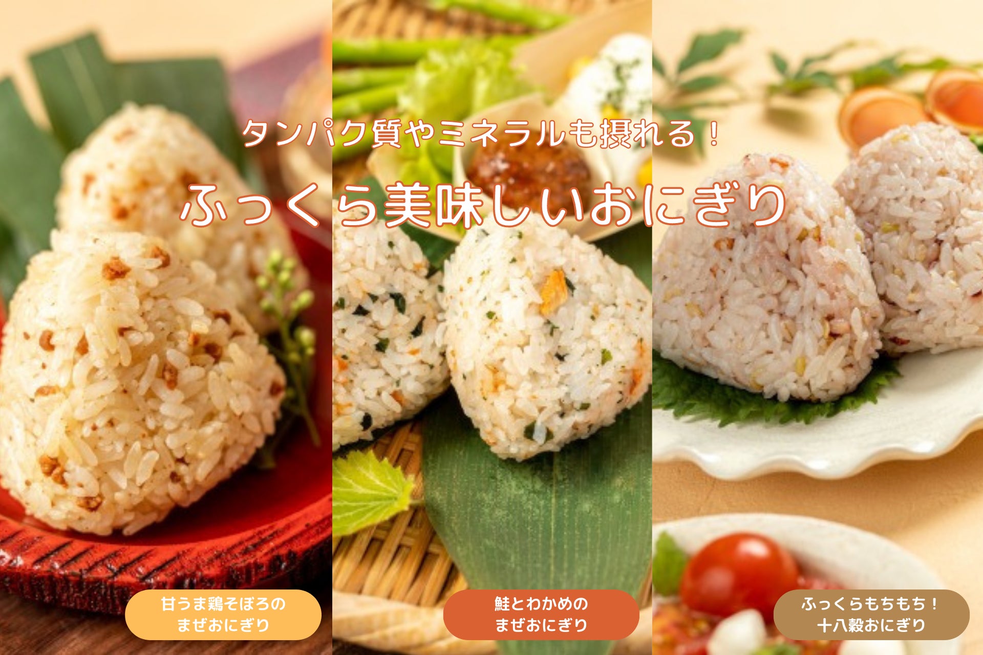 タンパク質やミネラルも摂れる「鮭とわかめのまぜおにぎり」「ふっくらもちもち!十八穀おにぎり」「甘うま鶏そぼろのまぜおにぎり」の3種類になります。