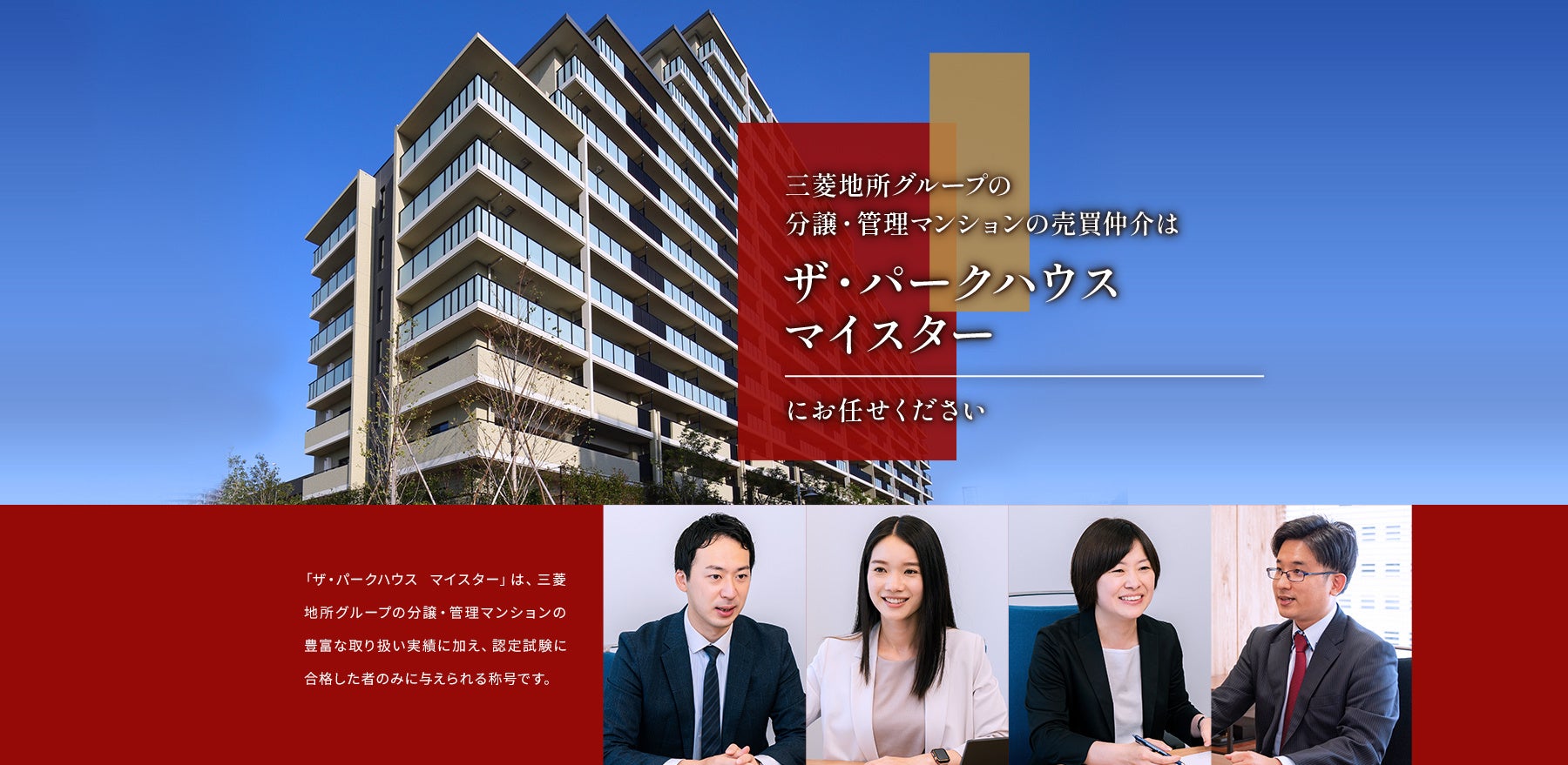 「ザ・パークハウス マイスター」は、三菱地所レジデンスが分譲する「ザ・パークハウス」シリーズをはじめとした、三菱地所グループ分譲・管理マンションに精通し、一定以上の取扱件数・経験年数を満たしたうえ、認定試験に合格した者に与えられる称号です。「信頼できる人に私たちのマンション売買を任せたい」というお客様の声を形にした不動産売買のプロフェッショナルが、大切なマンションの売買仲介をサポートします。