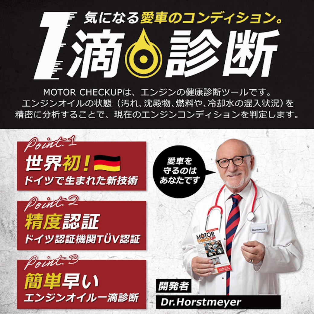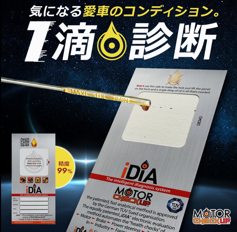 「モーターチェックアップ」では、ドイツの自動車技術者Dr.Horstmeyer氏が独自に開発した分析技術を活用し、エンジンオイルを特殊な試験紙(欧州における特許取得済み)に1滴採取。エンジンオイル中に含まれる金属成分や汚染物質を分析することで、エンジン内部の摩耗状況や汚染の進行度を詳しく評価する。その検査精度はドイツの国家認証機関である【TÜV】において真正性が確認されている。また、このサービスの最大の特長は、従来のエンジン精密診断に比べてリーズナブルな価格で提供できる点だ。自動車大国ドイツの高い技術力により、手軽にエンジンの健康状態をチェックできるようになったのだ。