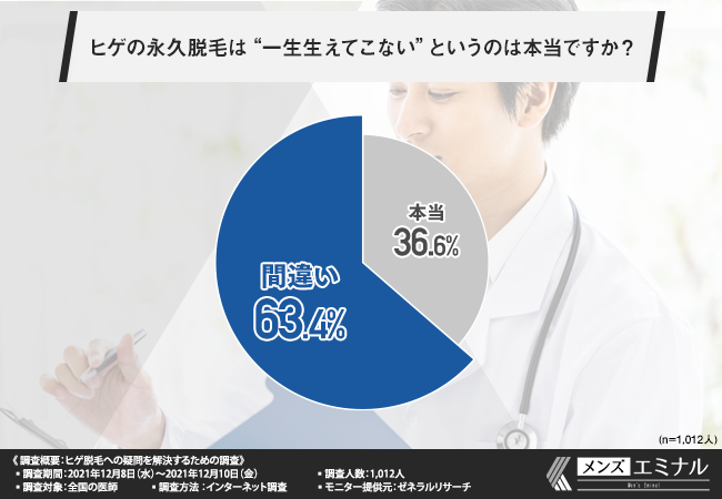「ヒゲの永久脱毛は“一生生えてこない”というのは本当ですか?」と質問したところ、6割以上の方が『間違い(63.4%)』と回答しました。