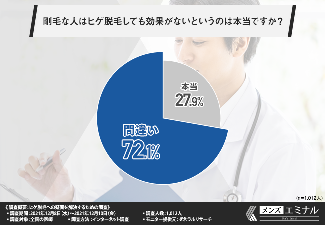 「剛毛な人はヒゲ脱毛しても効果がないというのは本当ですか?」と質問したところ、7割以上の方が『間違い(72.1%)』と回答しました。