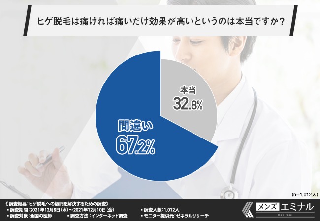 「ヒゲ脱毛は痛ければ痛いだけ効果が高いというのは本当ですか?」と質問したところ、7割近くの方が『間違い(67.2%)』と回答しました。