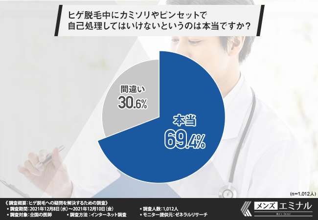 「ヒゲ脱毛中にカミソリやピンセットで自己処理してはいけないというのは本当ですか?」と質問したところ、約7割の方が『本当(69.4%)』と回答しました。