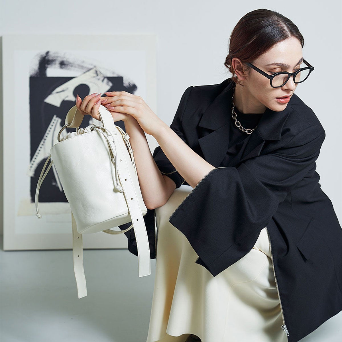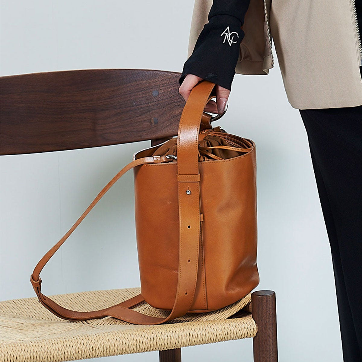 女性に特化した人気のバケツバッグ。hirokoが長年にわたり最も好む「円」をフューチャーし、どんな洋服にも合うとともに長く使い続けられる逸品に仕上げました。持ち手を短くすればトレンド感、ショルダーにすれば快適性アップ。ベルトの穴の数にもこだわりました。ふたの部分に巾着を採用することで中身を見られたくない場合は絞る、そうじゃない時は折り込んで使えます。角のある素材は一切使っていないので穏やかな雰囲気を纏ったバッグです。
