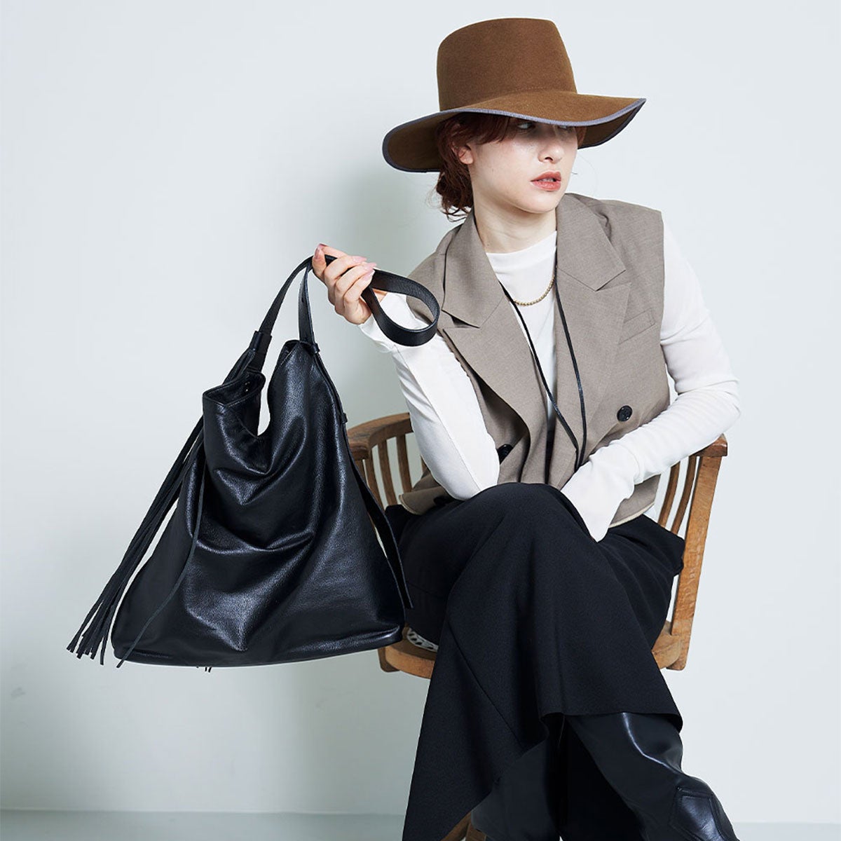 「あえて金具を使わない」にこだわったフリンジバッグ。アクセサリーの邪魔にならないからどんな装いにもフィットします。フリンジのディティールにも気を配ることで男性が使っても違和感ゼロ。ノートPCも収納できるサイズです。裏地は明るい配色で深めのデザインながら中身が見やすいのもポイント。内側のポケットが小物の収納に便利です。