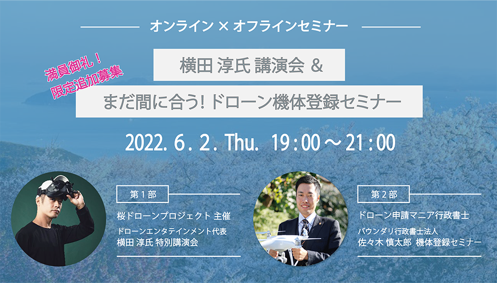 ドローンの関連許認可申請とソリューション開発を専門とするバウンダリ行政書士法人(本社:宮城県、代表行政書士:佐々木 慎太郎)は、2022年6月20日(月)から義務化される「機体登録制度」を踏まえ、ドローンに関心がある人やドローン保持者を対象にした「機体登録セミナー」を2022年6月2日(木)に開催いたします。セミナーでは「桜ドローンプロジェクト」でも知られる株式会社ドローンエンタテインメント代表横田淳氏をお招きした講演会も同時開催いたします。