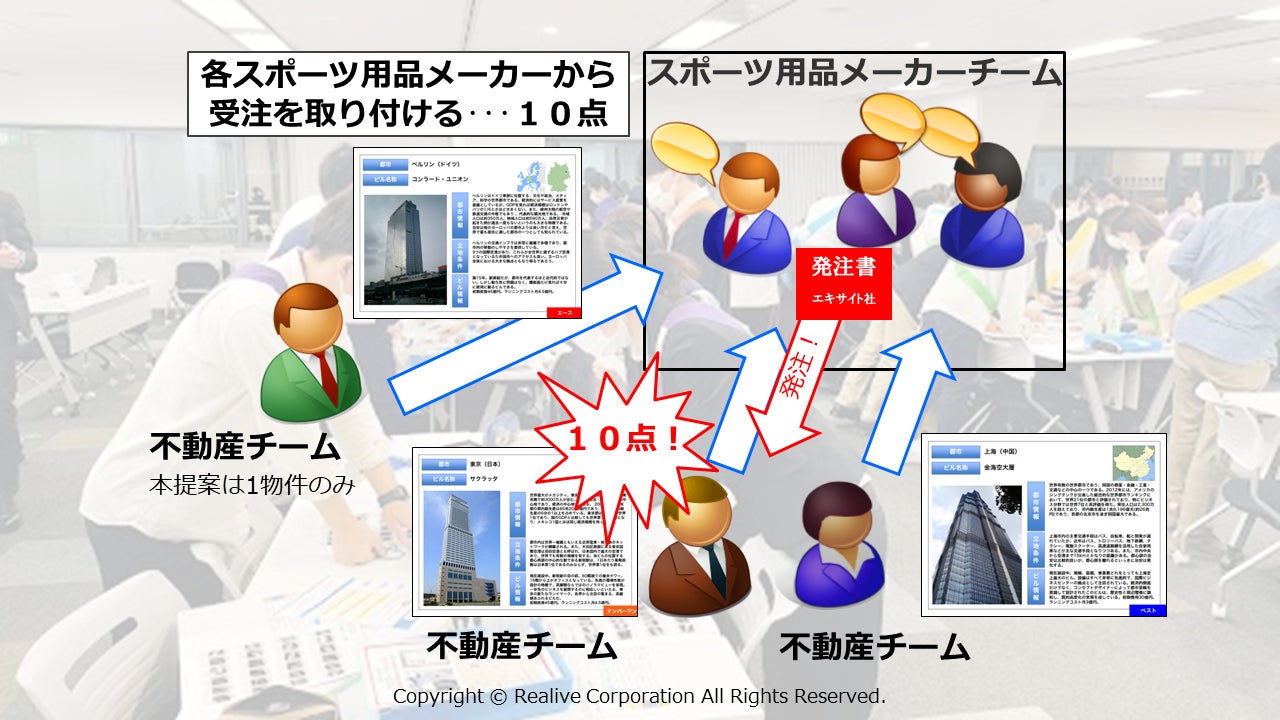 学生は不動産業界の「営業チーム」とスポーツ用品メーカーの「被営業チーム」に分かれて、営業する側とされる側双方を経験します。