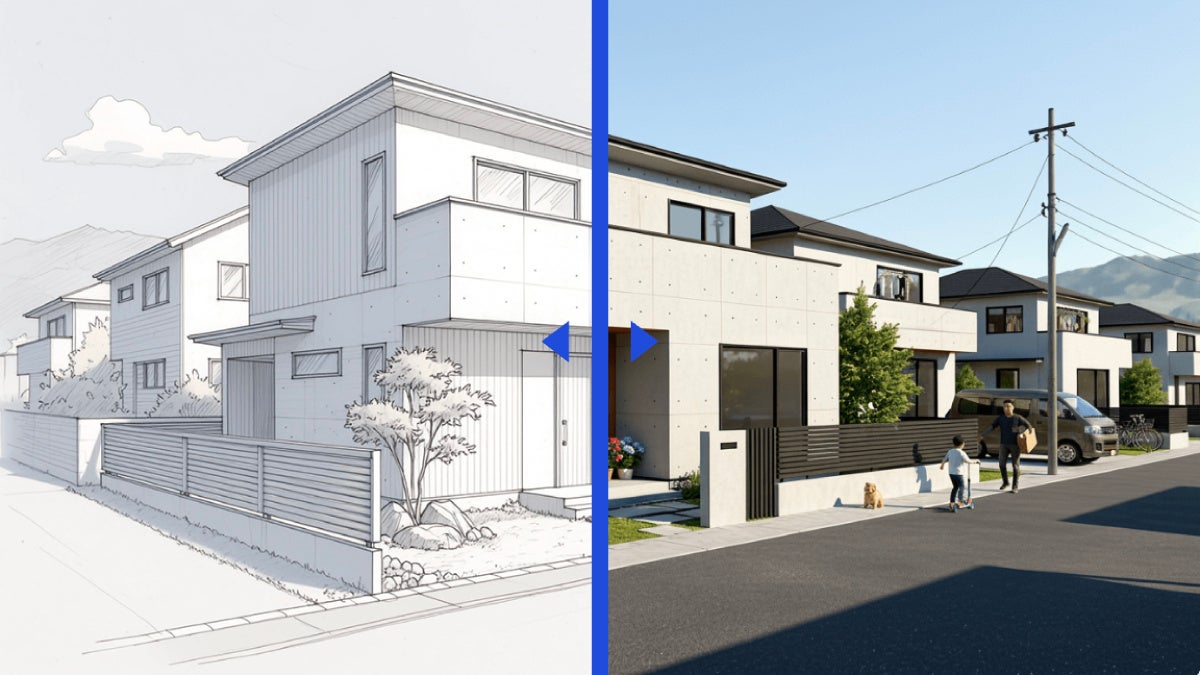 手書きスケッチや3Dモデル、平面図などをアップロードするだけで、高精度なビジュアルを瞬時に生成。建築・不動産業界の声を元に開発され、汎用的なAIでは制御が難しい「設計意図の反映」に優れています。4週間かかっていたデザイン提案をたった1日で可能にし、合意形成を劇的に加速させます。