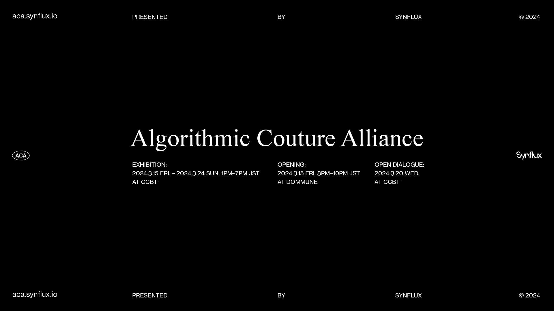 Synfluxはシビック・クリエイティブ・ベース東京[CCBT]の2023年度アーティスト・フェローとして、デジタル・ファッションの文脈を紹介する展覧会「Algorithmic Couture Alliance───デジタルとファッションをめぐる対話」を3月15日(金)─3月24日(日)に開催いたします。また、3月15日(金)には、SUPER DOMMUNEにてオープニングトークを配信、つづく3月20日(水・祝)には、多分野のプレイヤー/有識者の知見を共有するワークショップ「デジタルな私と滑らかなファッションデザイン?」も開催します。