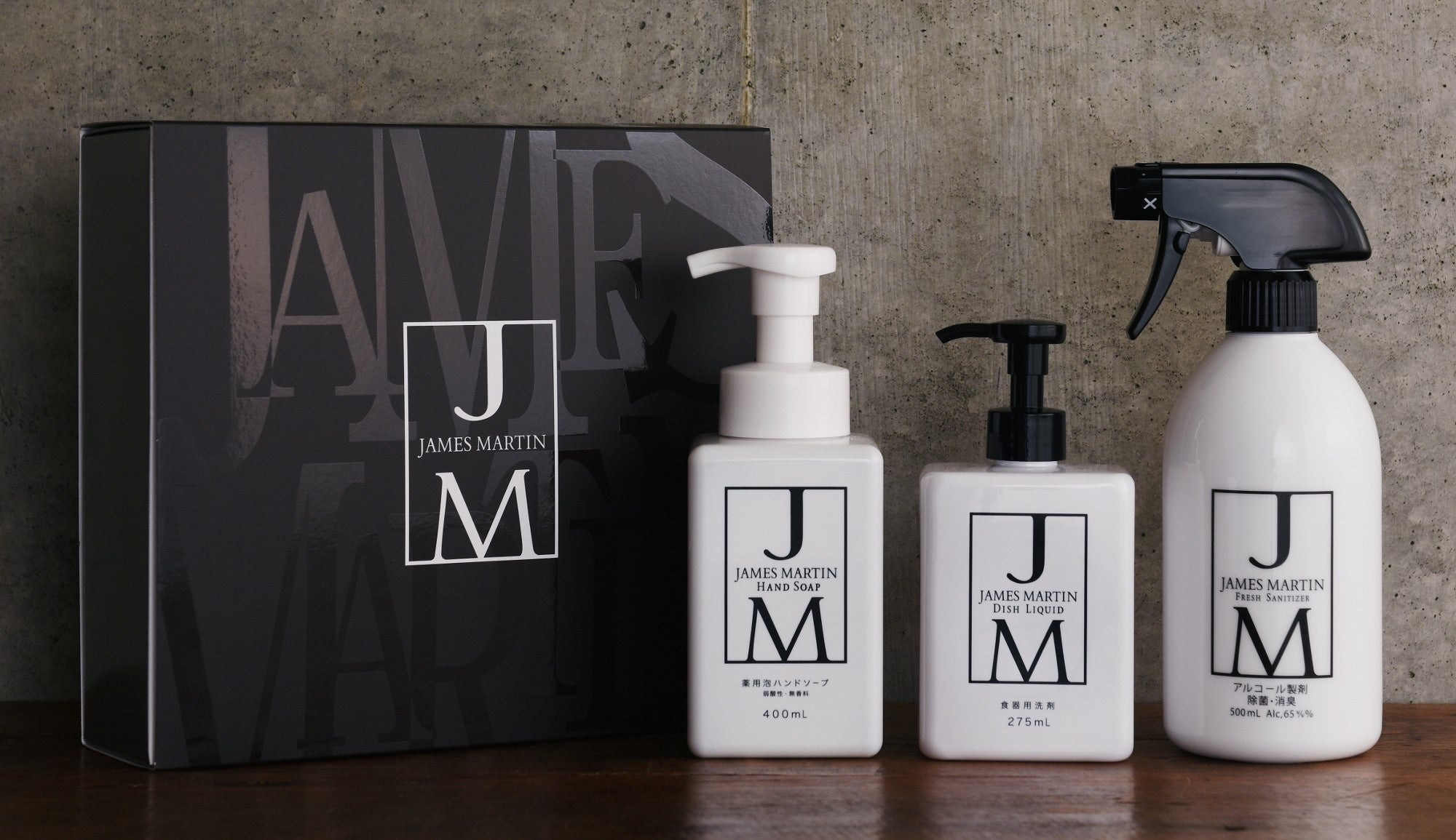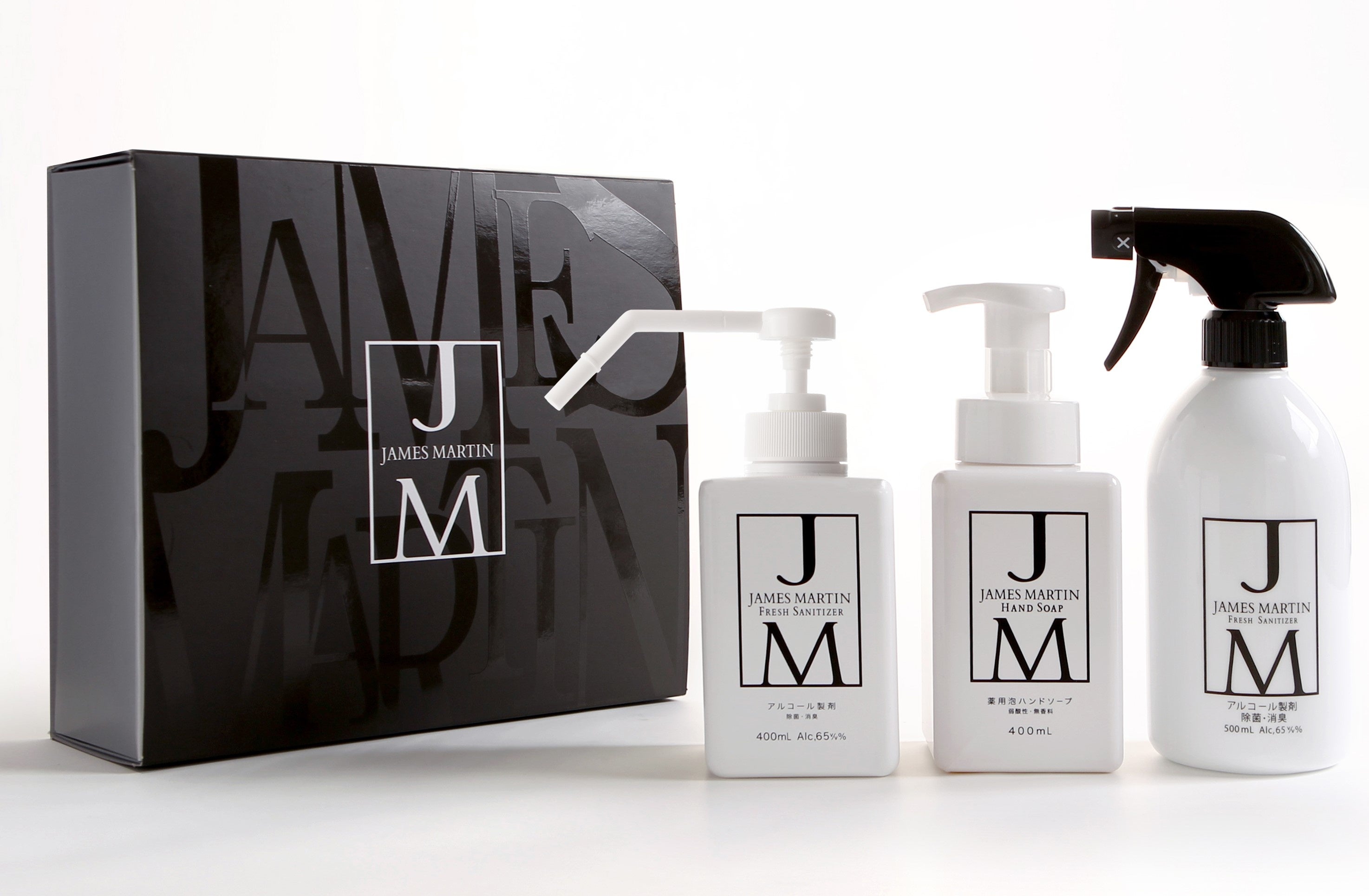 JAMES MARTINは、株式会社ファーストコレクションが展開する、除菌・洗浄に特化したブランド。「暮らしの景色を美しく」をコンセプトに様々な場所になじむスタイリッシュかつシンプルなデザインが特徴です。主力商品である「ジェームズマーティン フレッシュサニタイザー」は、様々なウイルス・細菌等に対する確かな除菌効果のあるアルコール製剤です。飲食業界から確かな信頼を得て、用途に応じたサイズ・ボトル展開でシリーズ化し、一般のご家庭、オフィス、医療機関等でもご愛用いただいている製品です。