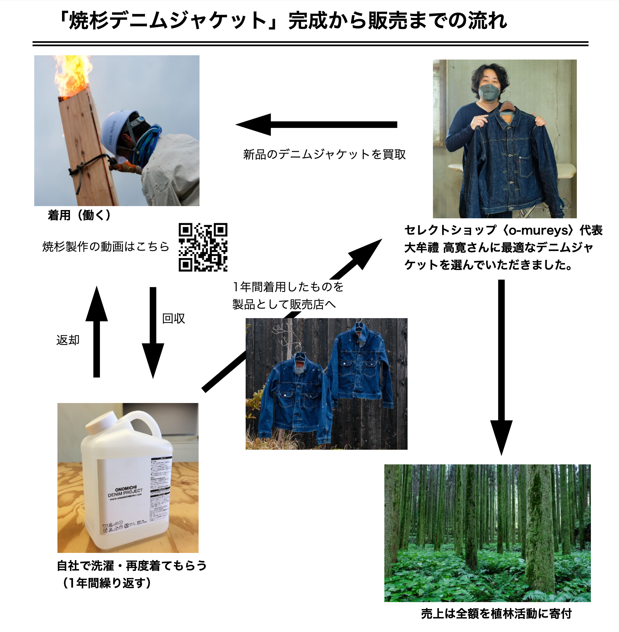 「焼杉デニムジャケット」は、マルヤガーデンズ鹿児島(鹿児島県鹿児島市呉服町6-5)4Fのセレクトショップ〈ナイナラ〉にて4/29より販売開始。本プロジェクトの収益は、販売店舗への協力金などを除き、全額を九州の植林活動に寄付します。焼杉に使う主な材料は九州の杉材。地元林業の活性化、好循環化に貢献できればと考えています。