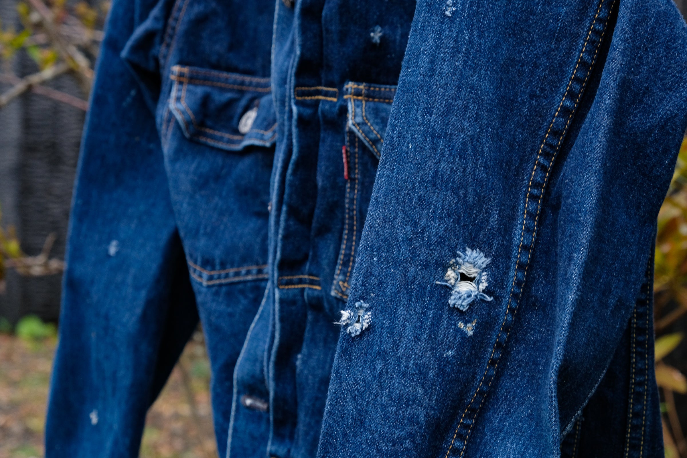 〈焼杉デニムジャケット〉は、焼杉製作に大工が実際に着用したジャケットです。1年間着用することで、火の粉による焼け跡や衣擦れによる“リアルダメージ”が加わります。大工の動きの癖や火の粉の飛び方によって、デニムの色落ち、ダメージ具合は千差万別。世界に一着のジャケットには、大工一人ひとりの物語が刻まれています(写真下)。