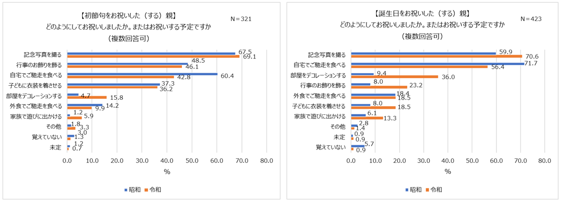 また、祝い方を昭和親・令和親で比較してみたところ、特に差が見られたのは「初節句」と「誕生日」でした。初節句では、昭和親の方が「自宅でご馳走を食べる(昭和親60.4%・令和親42.8%)」傾向があり、反対に、令和親の方が「部屋をデコレーションする(昭和親4.7%・令和親15.8%)」傾向があることが分かりました。誕生日では、昭和親は「自宅でご馳走を食べる(昭和親71.7%・令和親56.4%)」、「記念写真を撮る(昭和親59.9%・令和親70.6%)」の二つに多くの票が集まった一方で、令和親では「部屋をデコレーションする(昭和親9.4%・令和親36.0%)」、「行事のお飾りを飾る(昭和親8.0%・令和親23.2%)」にも2割以上の票が集まり、祝い方が多様化していることがうかがえました。