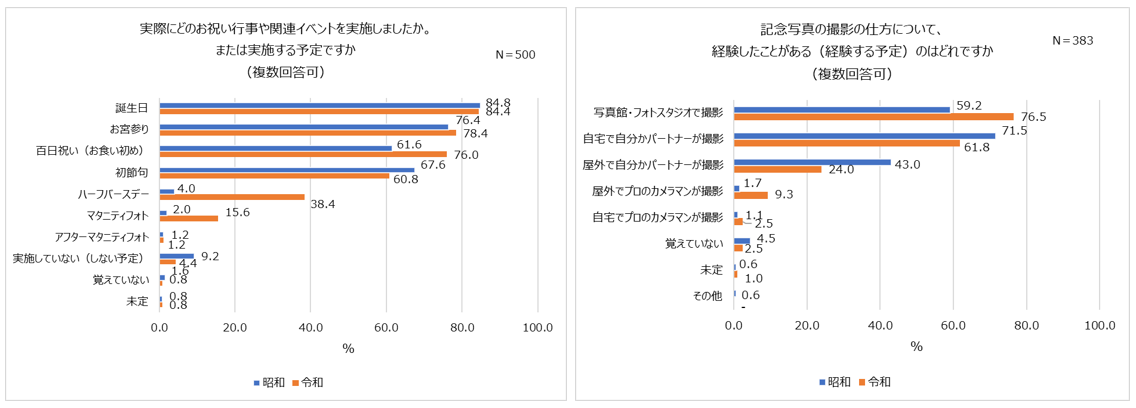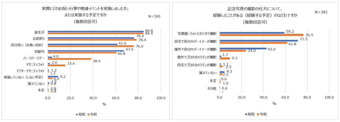本調査では、お宮参り、誕生日、マタニティフォトなど、赤ちゃんのお祝い行事や関連イベントについて、認知度やお祝いの実施有無、祝い方や招待客、実施理由など様々な実態について調査しました。昭和親と令和親で傾向を比較し、令和親の約4割が「ハーフバースデー」を祝うことや、令和親の方が写真館・フォトスタジオで撮影する傾向があることなどが明らかになりました。