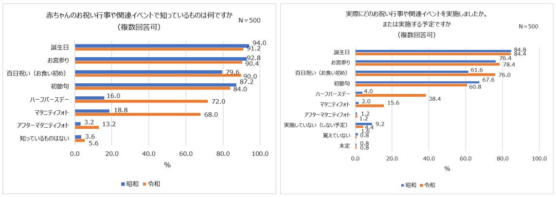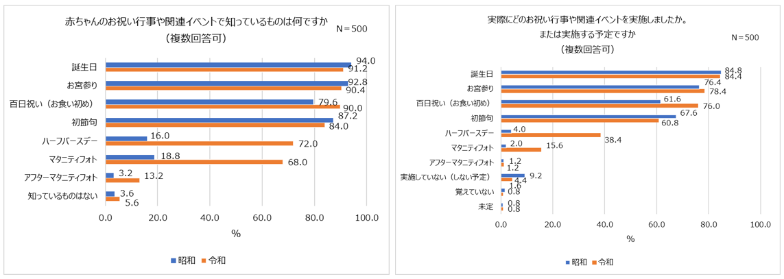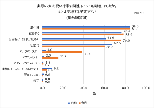 まず、各イベントの認知度について調べると、昭和親・令和親ともに9割以上が「誕生日(昭和親94.0%・令和親91.2%)」はもちろん、「お宮参り(昭和親92.8%・令和親90.4%)」を知っていると回答。「百日祝い(昭和親79.6%・令和親90.0%)」、「初節句(昭和親87.2%・令和親84.0%)」も多くの人が知っていると答え、昭和親・令和親ともに認知度が高いイベントであることが分かりました。