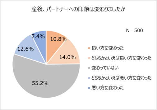 - 4.産後のパートナーへの印象「良い方に変化」24.8%、「悪い方に変化」20.0%、「変化なし」55.2%