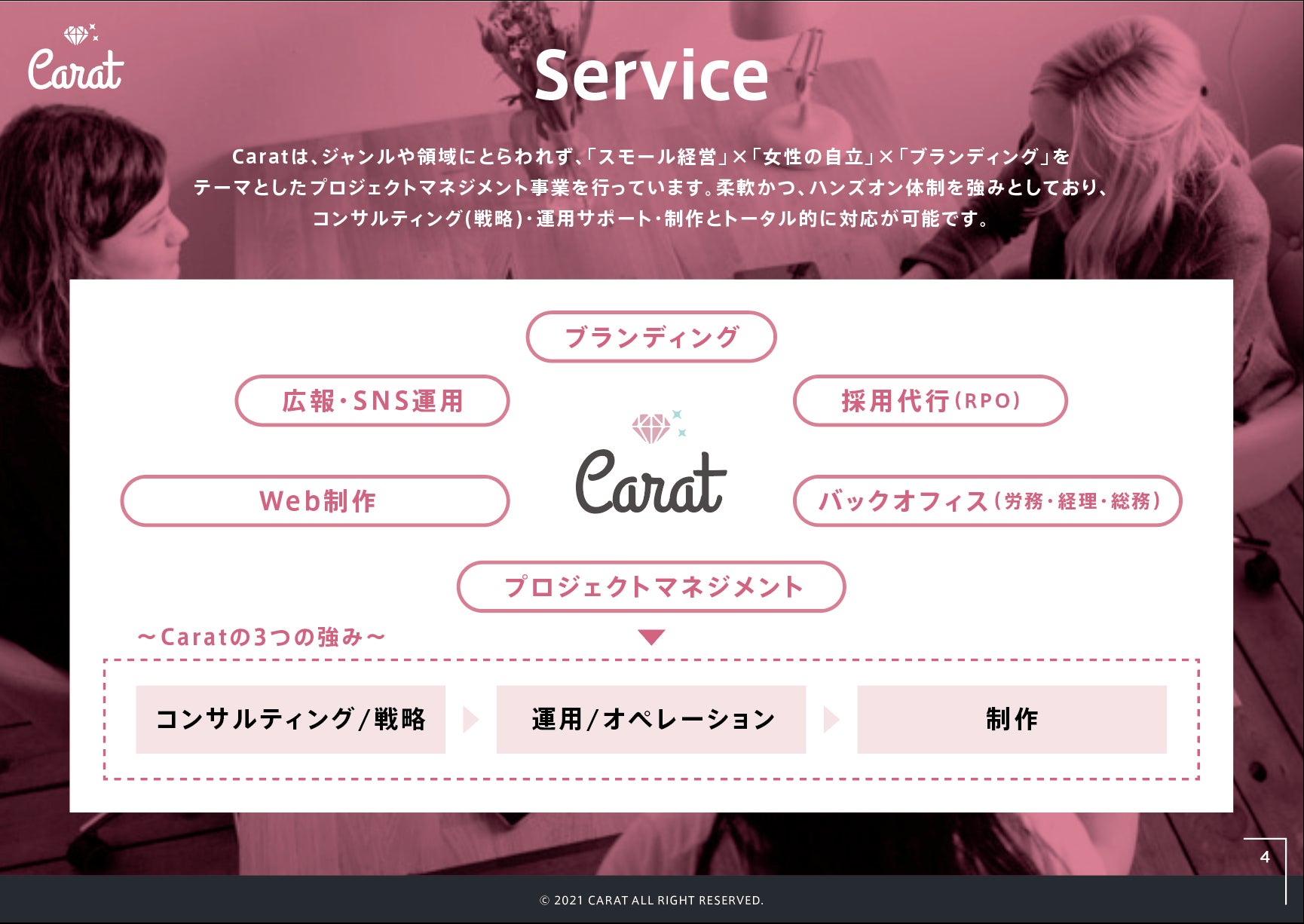 Carat株式会社は、全員が女性、全員がフルリモートワークのプロジェクトマネジメントに特化した専門集団です。オーダーメイド型かつ貴社のメンバーの一員として入り込むハンズオン体制で進行することを強みとしています。これまで、完全紹介制にて、主にコーポレートブランディング・人事・採用・広報領域にて、合計130以上のプロジェクト支援を行ってきました。この度、両社の強みを活かして女性向けのブランディング支援を強化してまいります。コーポレートブランディング・採用広報・PRをはじめとしてLP制作やHP制作、撮影等幅広くご活用いただけるようになります。ぜひご相談をお待ちしております。