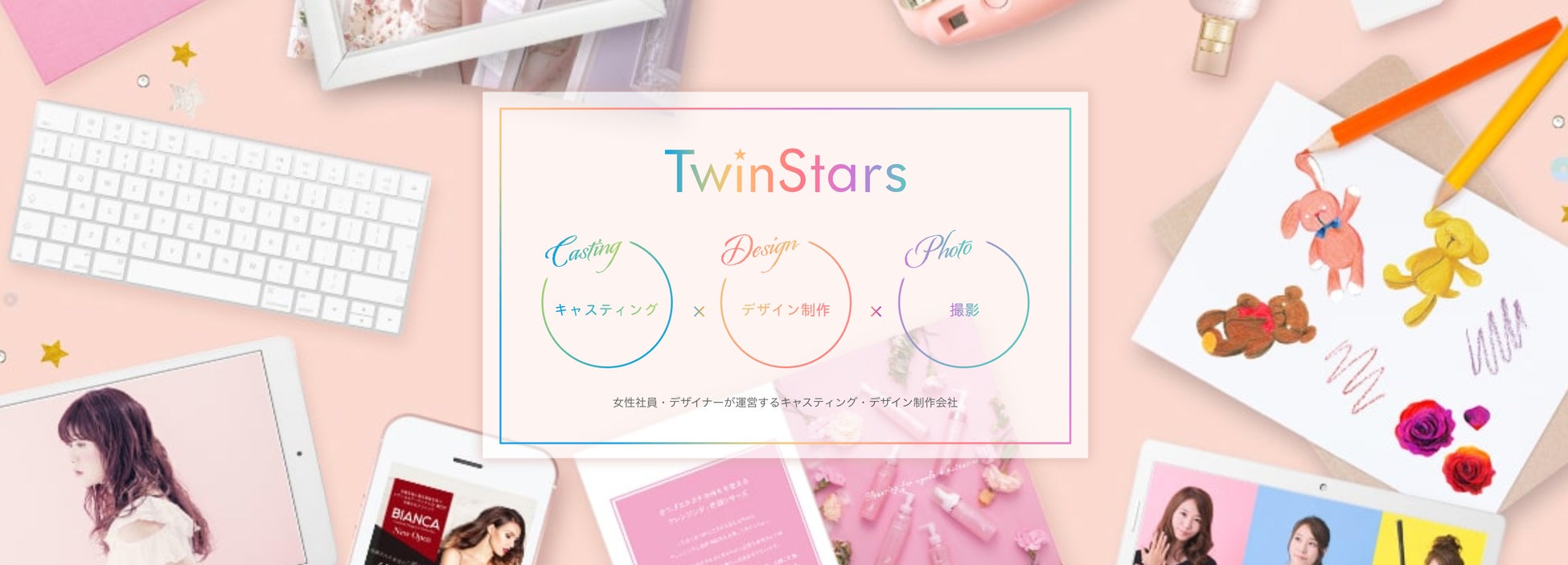 株式会社TwinStarsはデザイン制作・WEB制作事業、キャスティング事業、撮影スタジオ事業の3軸で会社運営を行う女性社員中心の制作会社です。「撮影」「デザイン制作」「キャスティング」は、制作において必要不可欠となっています。この3つの事業を自社内にリソースを持つことで、クライアント様が複数社に発注する手間も省けるだけでなく、オールインワンでプロジェクトを進めることが出来るため、「ローコスト」なのに「高品質」なサービス提供を実現しております。現在お取引をさせてもらっている 9 割の企業様にリピートのご発注を頂いております。