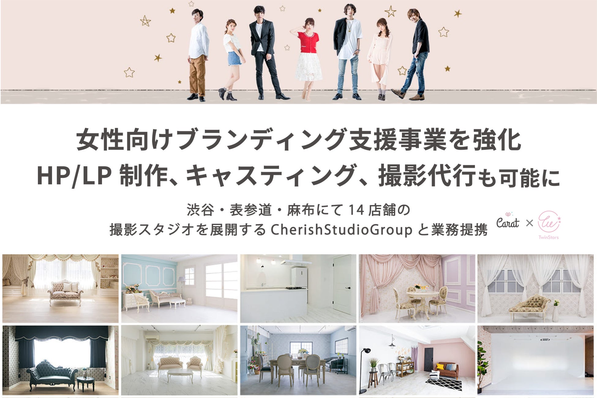 Carat株式会社(本社:東京都渋谷区、代表取締役社長:中屋まり、以下「Carat」)は、このたび渋谷・表参道・麻布にて14店舗の撮影スタジオを構える「CherishStudioGroup」を運営する、株式会社TwinStars(本社:東京都渋谷区、代表取締役CEO:田口真弓、以下「TwinStars」)と業務提携をし、HPやLP制作、キャスティング、撮影代行等のサービスを開始しました。当社の得意領域である、コーポレートブランディング・採用支援(RPO)・人事コンサルティング・広報活動(SNS運用含む)とともに、オフィシャル写真の撮影、宣材写真の撮影、インタビューの撮影等、幅広くご支援が可能となります。