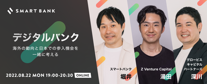 家計簿プリカ「B/43(ビーヨンサン)」を提供する株式会社スマートバンク(本社:東京都品川区、代表取締役:堀井 翔太)は、Fintech領域への造詣が深い、深川康介氏(株式会社グロービス ・キャピタル・パートナーズ)、湯田将紀氏(Z Venture Capital株式会社)をお迎えし、「デジタルバンク 海外の動向と日本での参入機会を一緒に考える」をテーマにしたオンラインセミナーを2022年8月22日(月)に開催いたします。(申込み:https://smartbank.connpass.com/event/254273/)