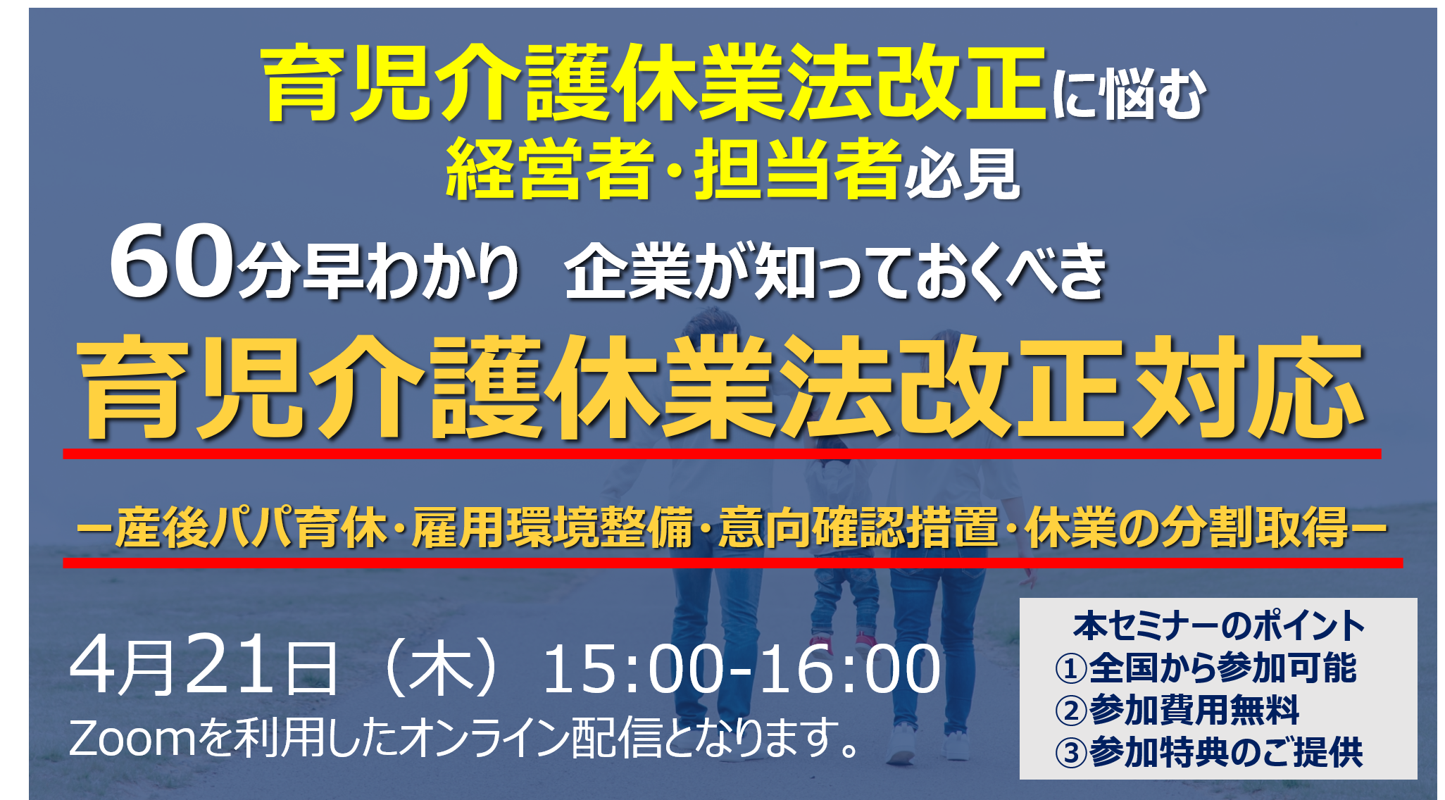 『育児介護休業法改正対応セミナー(無料オンライン60分早わかり)』を4月21日(木)開催