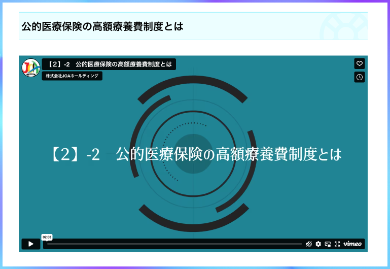メールではなく対面で説明を行う場合も、直接お客様に動画を視聴頂く事で理解を深めて頂くような使い方も可能です。また募集人が動画を閲覧する事で、公的保険の知識を容易に身につける事も出来ますので、募集人の学習効率を上げ、公的保険の説明品質の統一を図る事が出来ます。
