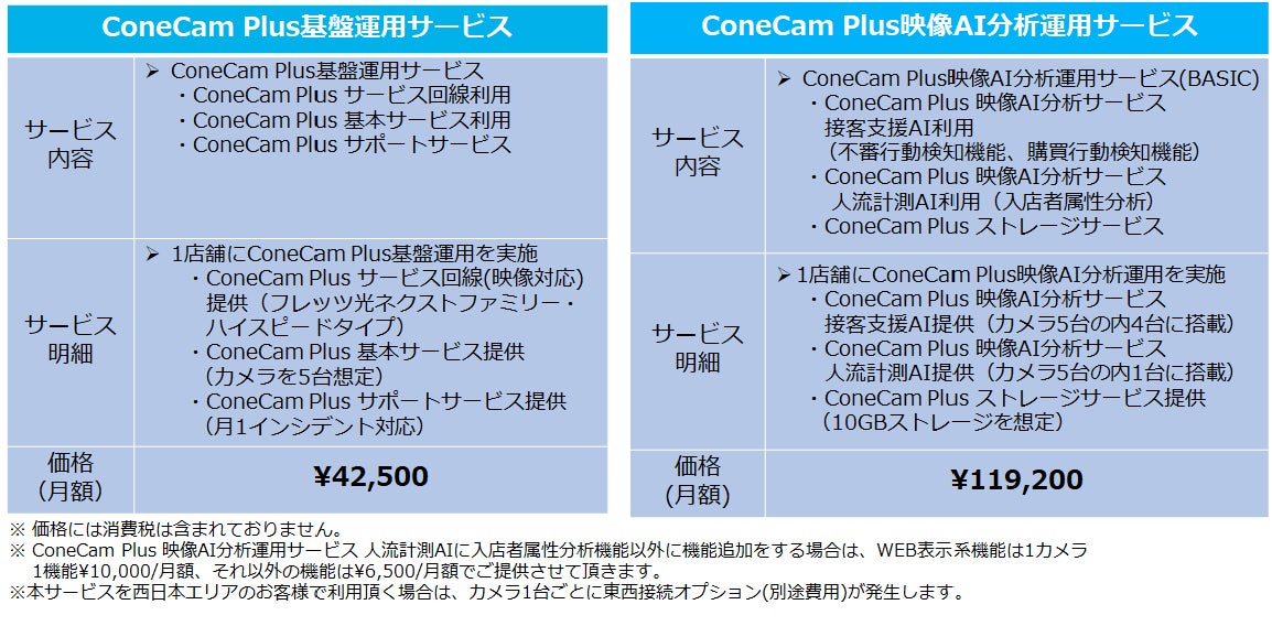 ConeCam Plus基盤運用サービスと映像AI分析運用サービス(BASIC)をセットにした、キャンペーンサービスパックのランニングコストになります。