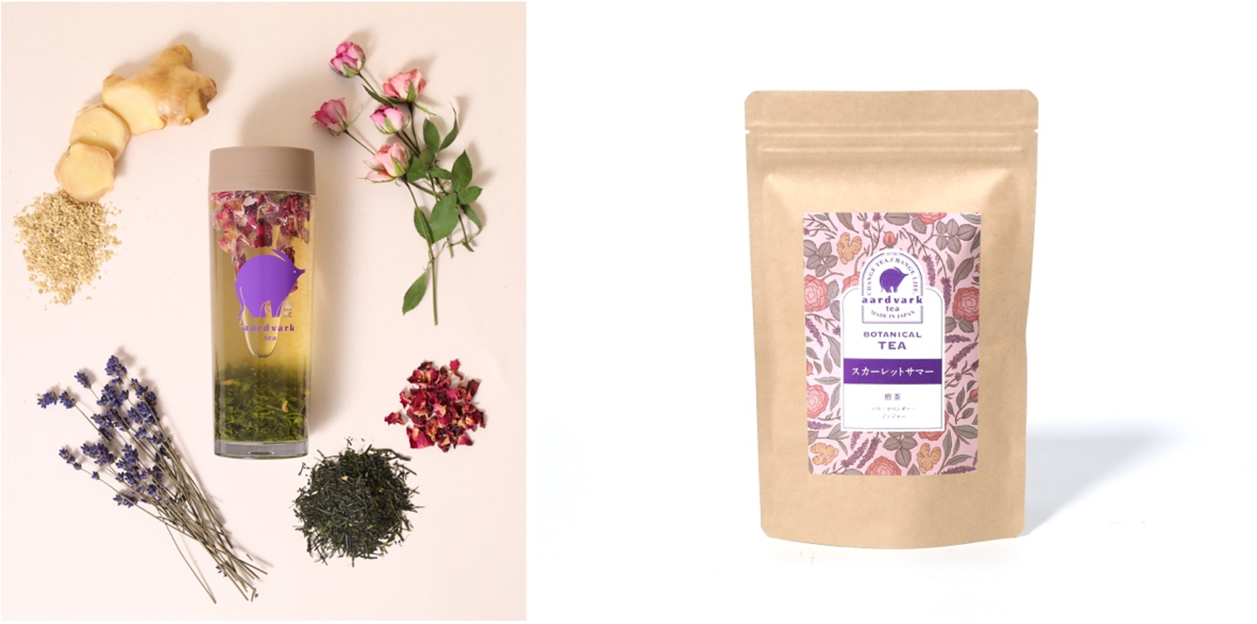 お茶の起源は実は薬。果実やお花、ハーブといった自然素材と合わせ、体調や気分にあわせフレーバーを処方する、というコンセプトで出来上がったのが、aardvark teaの日本茶ボタニカルティーです。身体のコンディションや気分にあわせて、お茶を選び、心身整う一服をお楽しみいただけます。