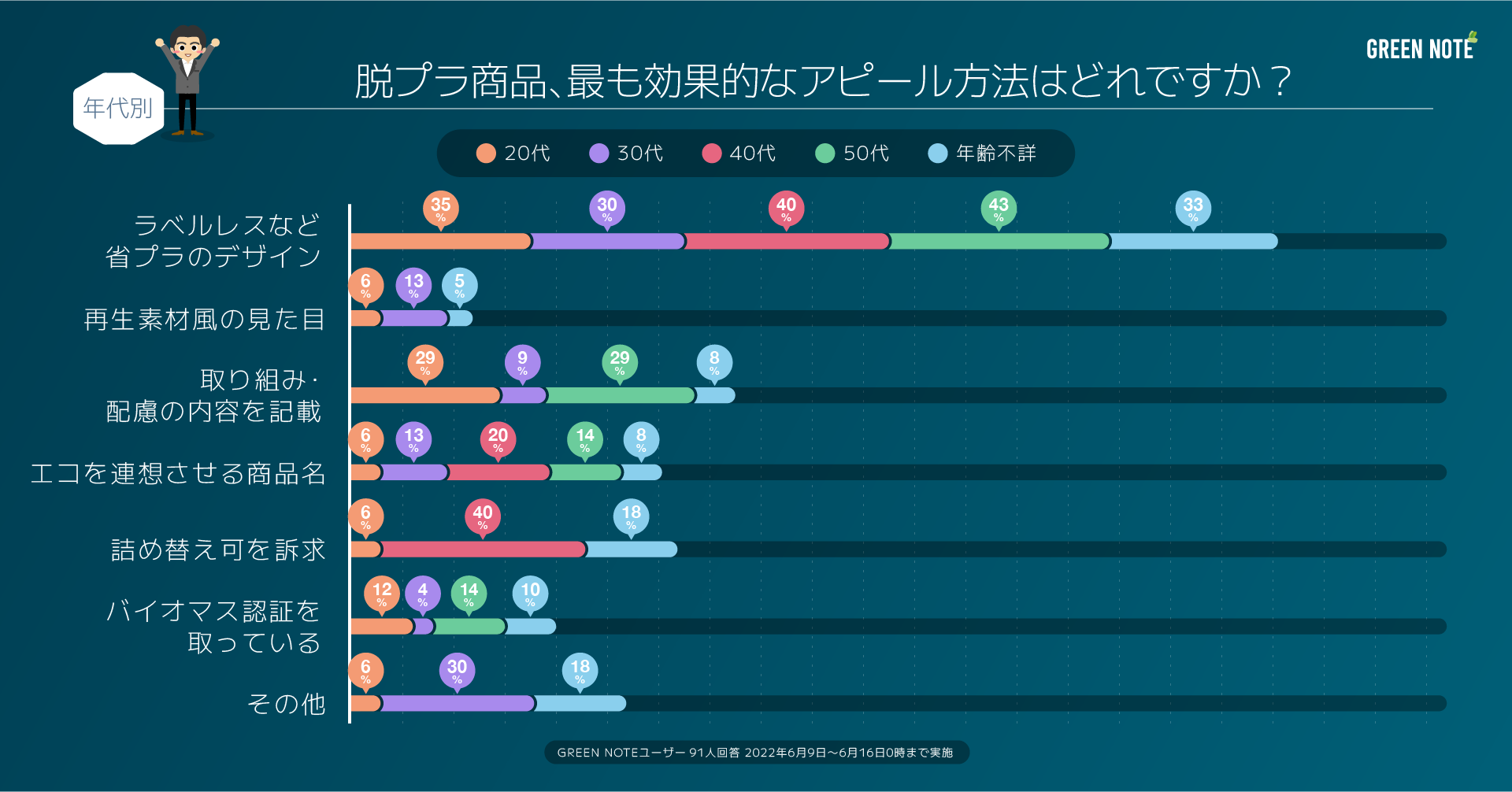 Greenroom株式会社(本社:東京都新宿区、代表取締役:山崎 修平)が運営するサステナビリティ / SDGs専門ニュースアプリ『GREEN NOTE(グリーンノート)』は、SDGsやサステナブルに関する意識を明らかにすることを目的に、サステナビリティに感度の高いアプリユーザー20~50代以上の91名を対象に「脱プラ商品の最も効果的なアピール方法」に関する市場調査を実施。
