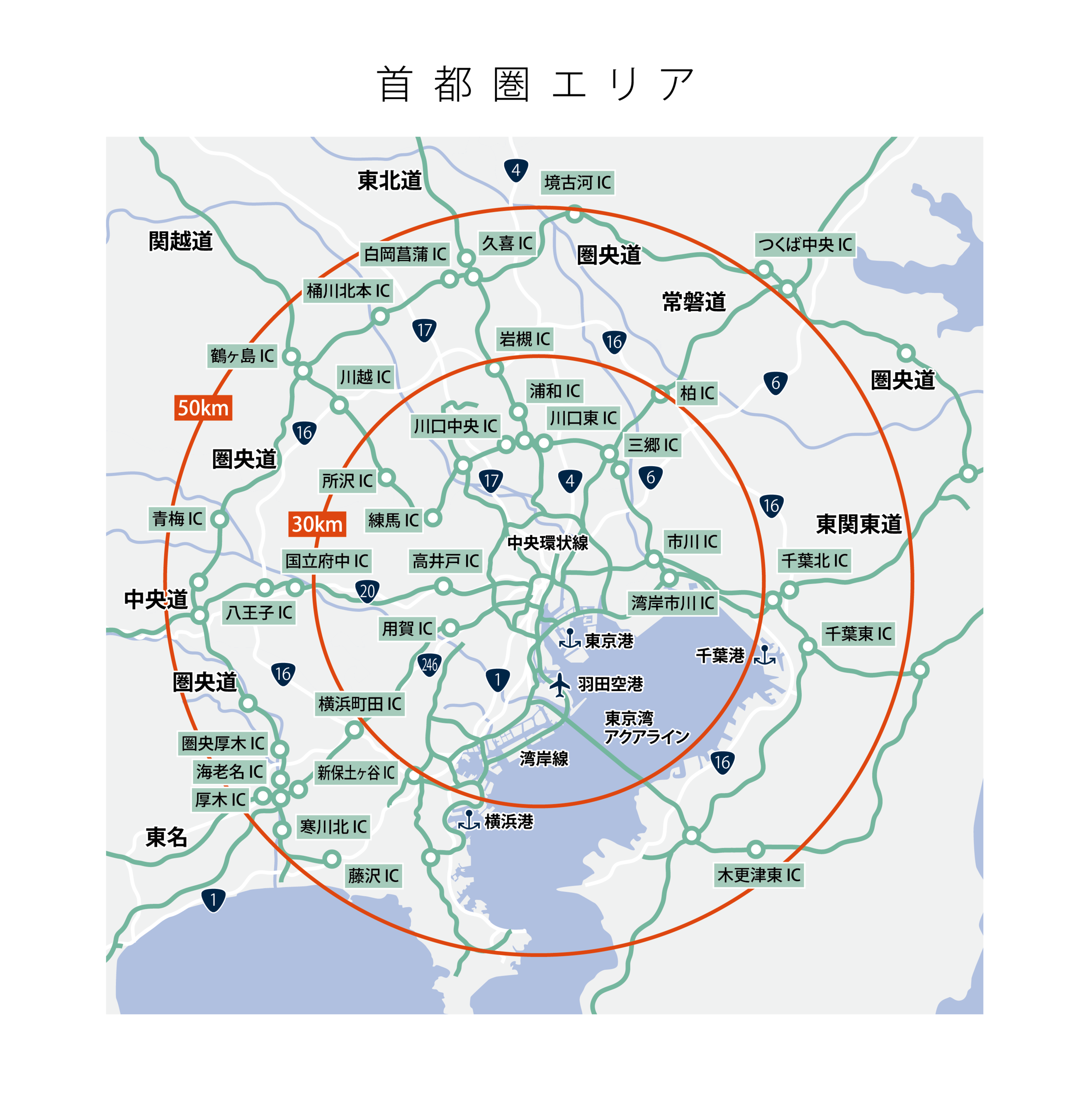 また、仙台東部道路の「仙台東インターチェンジ」「仙台港インターチェンジ」からそれぞれ約3.5kmと近接し、東北自動車道へもアクセス可能なことから、関東地方や東北各県 への広域配送拠点としての交通利便性にも優れています。さらに、東北唯一の国際拠点港湾である仙台塩釜港から約10kmという立地を活かし、海上輸送にも対応可能です。