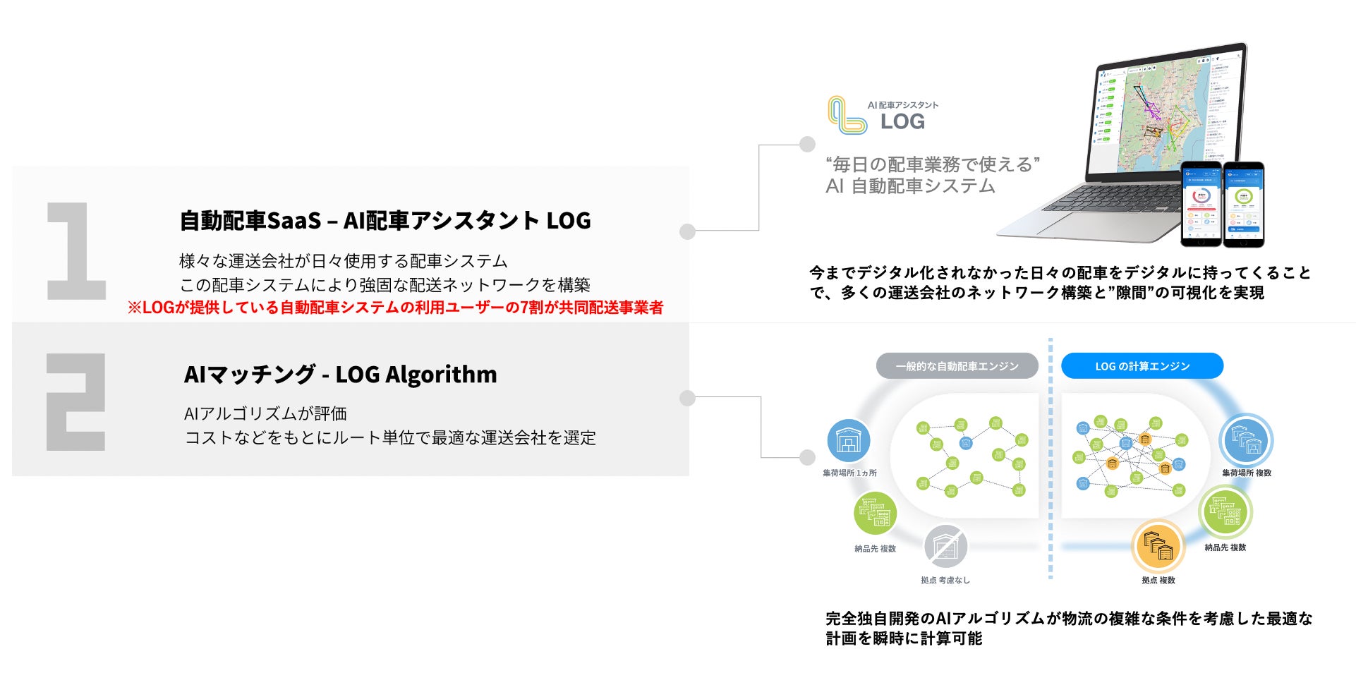 ログポースが共同配送コーディネート事業を行う理由として、配車システムによって作られた運送事業者ネットワークと高度な計算エンジンの存在があります。