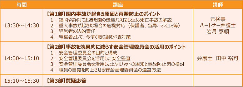 日頃、十分に事故に備えている園でも、予期しない事情から同様の事故や園外の置き去り事故を引き起こす可能性は否定できません。園内事故防止のため、経営者として今すぐ取り組むべき対策、事故発生時の当局/保護者/マスコミ対応や法的責任の内容もお伝えいたします。「認定こども園の事故対応の関係府省会議」で、本年10月中にとりまとめ予定の「緊急対策とりまとめ」「安全管理マニュアル」についても事故防止のポイントを解説します!