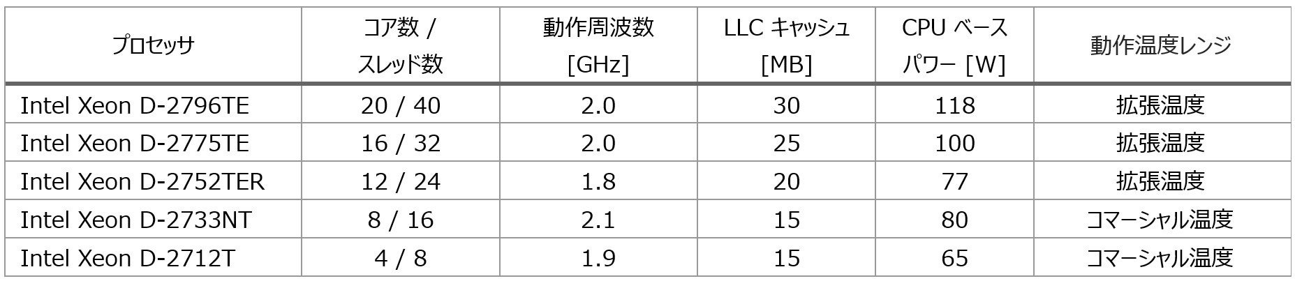 新しいモジュールは、インテル Xeon D プロセッサシリーズのHigh Core Count(HCC)およびLow Core Count(LCC)の、さまざまな品種から選択することができます。
