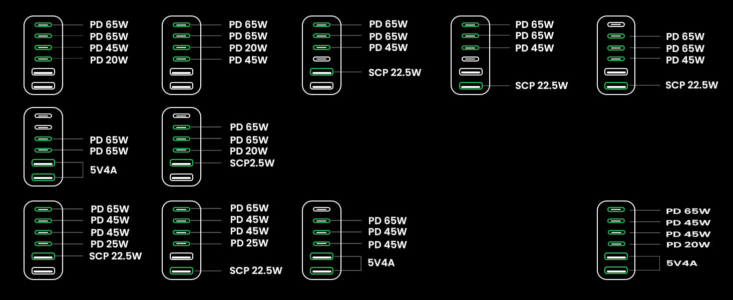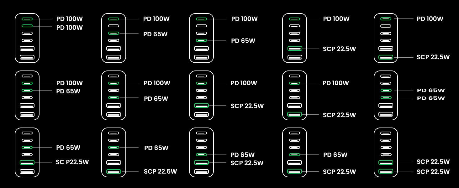 独自のGaN II技術を採用して小型化に成功しながら、本体にはUSB PD 3.0対応のUSB−Cポートが4つとUSB-Aポートを2つ搭載。4つのUSB−Cポート同時利用時には、各ポートから最大65W、65W、45W、20Wの超高出力に対応します。3つのUSB−Cポートを同時利用する際には、MacBook Air / MacBook Pro M2 などのノートPCを三台同時に65Wの出力で急速充電することが可能です。