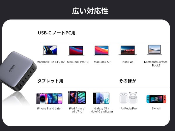 6つのポートを同時に利用する際は、iPhone 14を含むスマートフォンに加え、タブレット端末、Nintendo Switch、MacBook Pro M2などのノートPC、AirPodsなどのデバイスに対応します。これまで機器毎に用意していた複数の充電器をこの1台に集約できるため、使用機器ごとに出力の異なる充電器を持ち歩く必要がなく、自宅は勿論、外出時や仕事場のデスクを簡潔にまとめたい方などへおすすめです。