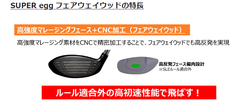 「SUPER eggフェアウェイウッド」はフェースに高強度マレージング鋼を採用し、CNCで高精度フェース偏肉加工を施すことにより、フェアウェイウッドでもルール適合外の高反発を実現しています。さらに、従来品同等の慣性モーメントと低重心設計でやさしさを維持しながらも重心をやや浅めに設計することで適度なつかまり、上がりやすさ、低スピンの「強弾道」を実現させました。また、クラウン後方センター部分をハイバックとし、そこからフェース方向にラインを施すことでボールを真っ直ぐ、強く押し込む「強弾道」をイメージできるデザインとしています。